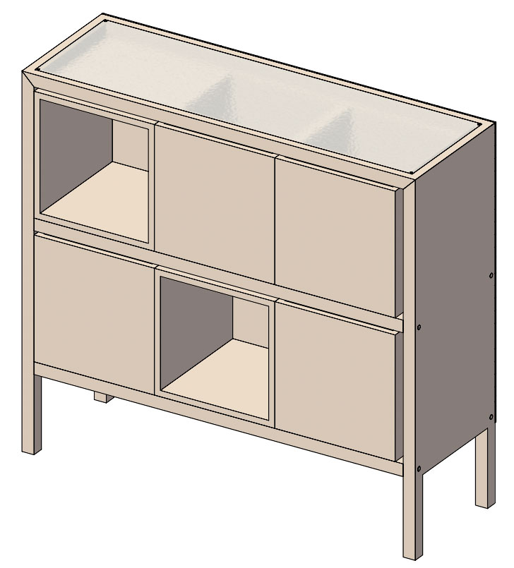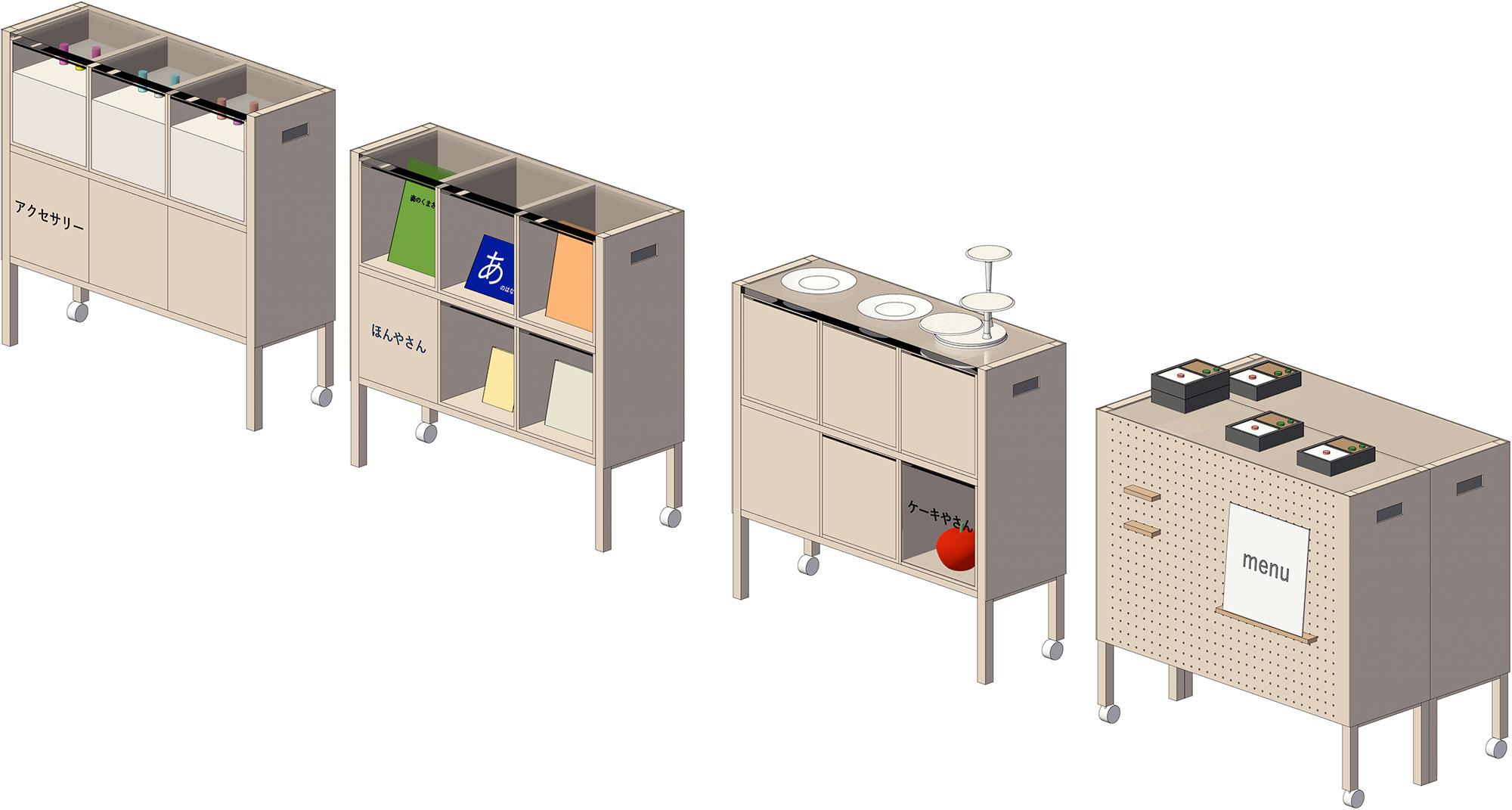 透明な天板、カウンター裏側に貼ってある有孔板、6個のボックスの組み合わせで、様々な使い方ができます。